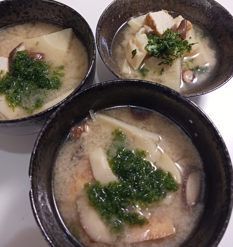 材料 ・孟宗竹(タケノコ)・しいたけ・厚揚げ・顆粒だし・熟成にぼし・味噌・酒粕・あおさ海苔
