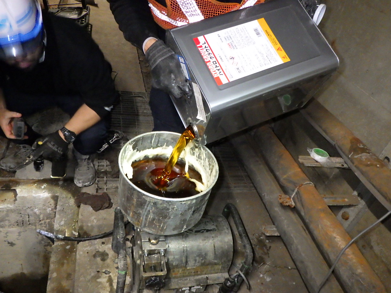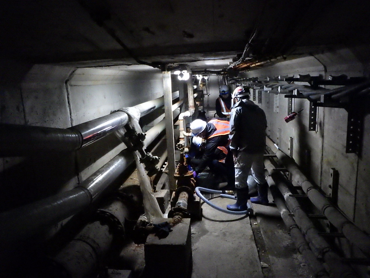 国土交通省 関東地方整備局 相武国道事務所 発注で府中洞道排水設備沈砂槽底盤の止水工事です。 昨年、某コンサル様より本案件の相談を受けました。 洞道内が大量の水に浸水するそうです。弊社は大和式バルブコック付きのプレートを設置し親水性ポリウレタン止水材を注入する工法を提案、その工法が採用され設計図面にも大和式止水プレートが明記されました。弊社は、技術指導として施工にあたりました。レンタルポンプの圧力が2MPa程度しかなく湧水の圧力に負けて材料が逆流した場面もありましたが、想定内の状況の中で無事止水することができました。止水材はシーカ・ジャパン㈱社製の「ハイドログラウトL」、大和式止水プレートの接着はエレホン・化成工業㈱製のエレホン#300、注入ポンプは㈱友定建機ミニポンプTS-002を使って注入しました。