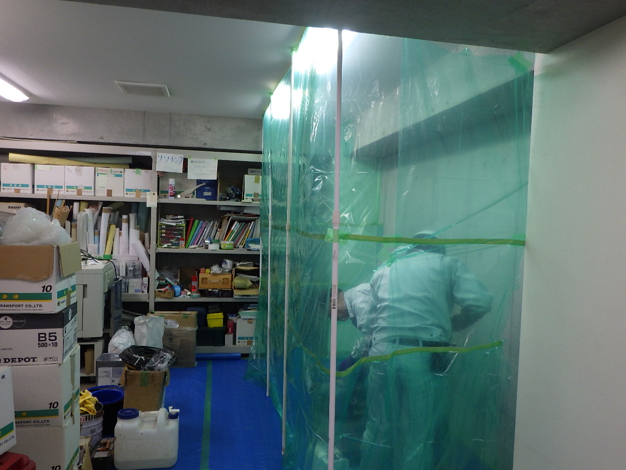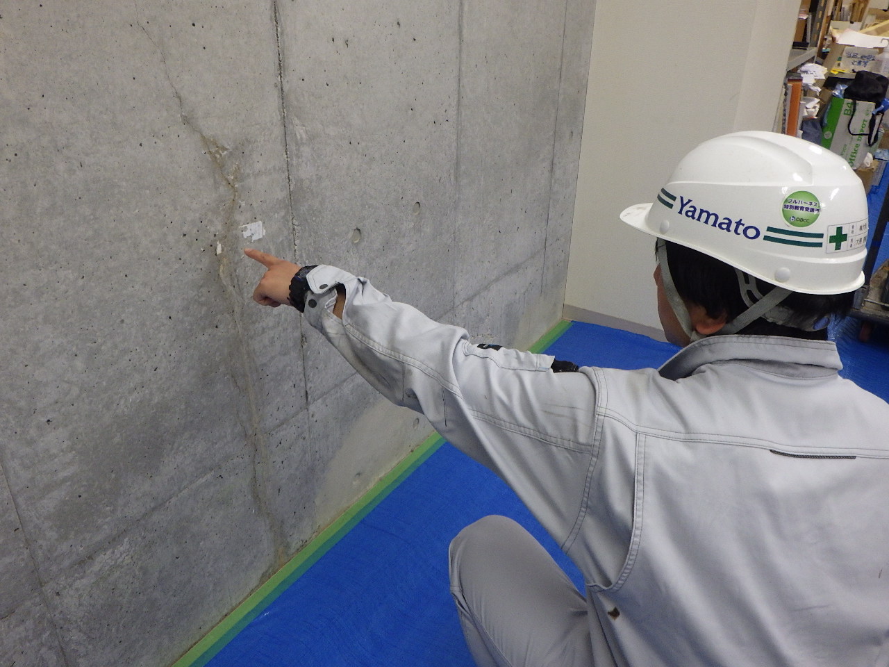 弊社ホームページからのお問い合わせです。本物件は、民間ビル会社様からのお問い合わせでした。T社長が弊社までお越しになり、高圧注入施工方法及びアス・ストップの材料についてご説明差し上げました。現場調査の依頼を頂き、K工事長とともに実施しました。壁部ひび割れ漏水跡(2.3m)を確認、その他床壁の打ち継ぎ目(3.5m)とジャンカ2か所も漏水の可能性があり、お見積もりに反映させました。2日の工事で、施工中に発生する粉塵やアス・ストップの飛び散り対策として特に養生はしっかり行いました。施工する中で、部屋側の基礎コンクリートとタイルカーペットの間に均しコンクリートが100mm程度あることに気付き、プラグの穿孔位置を的確に打ち継ぎ部に交わるようにしました。知識と経験豊富なK工事長、削孔のドリル音で分かるとは流石です。