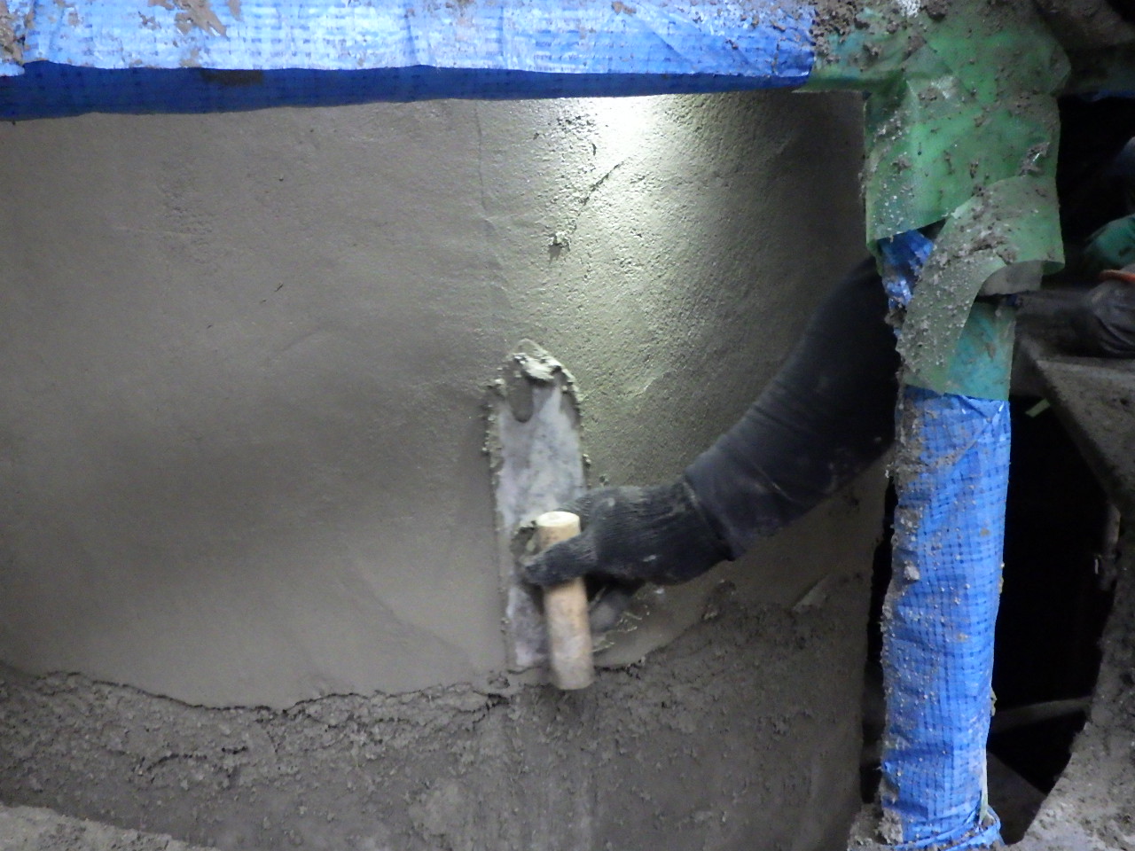 湿式PCM吹付後のコテ押さえ(1回の吹付厚は30mm程度まで)